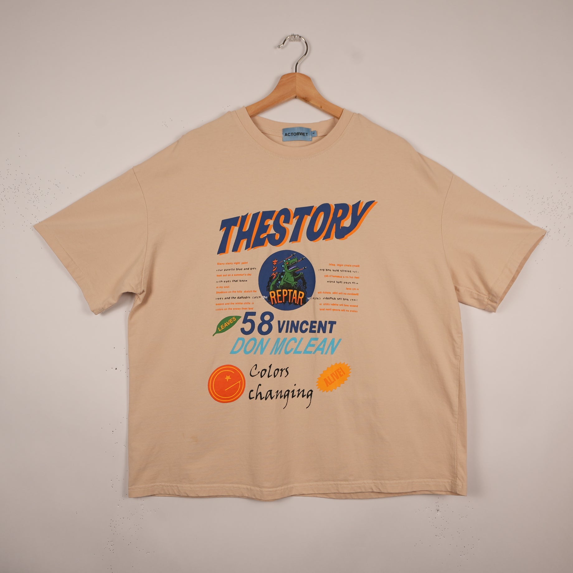 This ActorWet tee is a loud, colorful statement piece inspired by pop culture nostalgia and vintage print design. It features bold typography and vibrant graphics with references like “Reptar” and “The Story,” giving it that early-2000s retro streetwear energy.