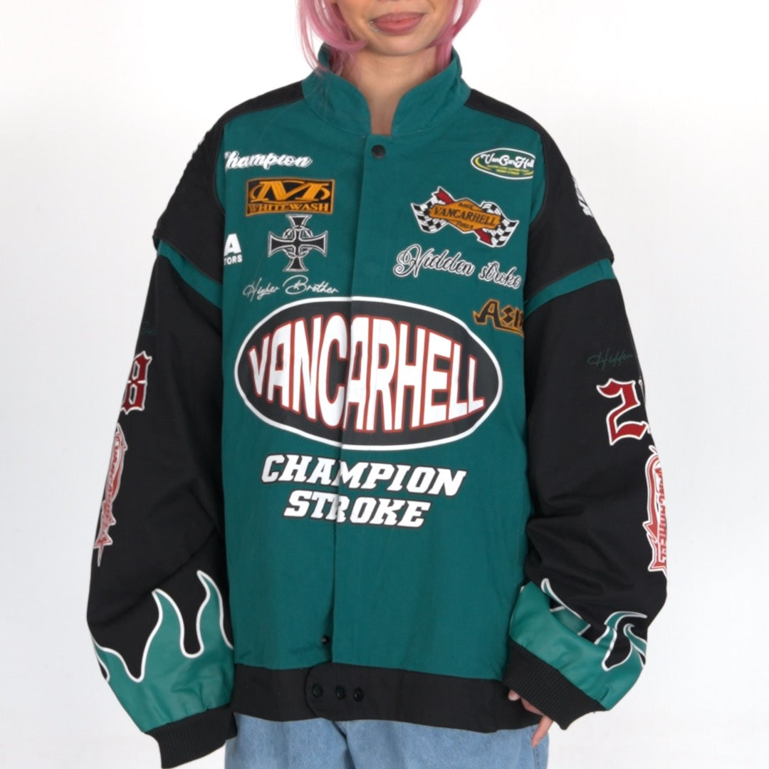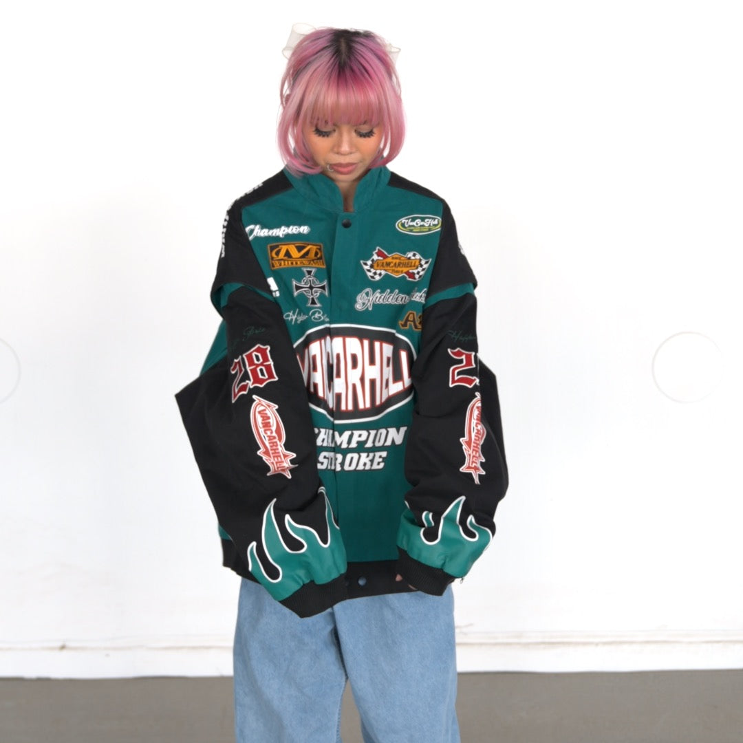 A bold Aelfric Eden racer jacket featuring Y2K-style racing graphics and flame details on the sleeves. The green and black colorway with patch-style branding gives it that classic motorsport aesthetic, making it a true statement piece.