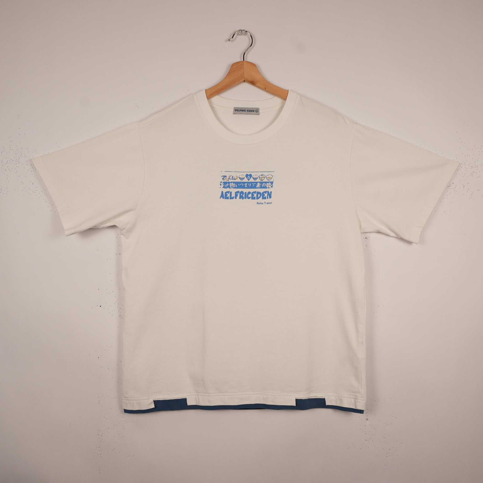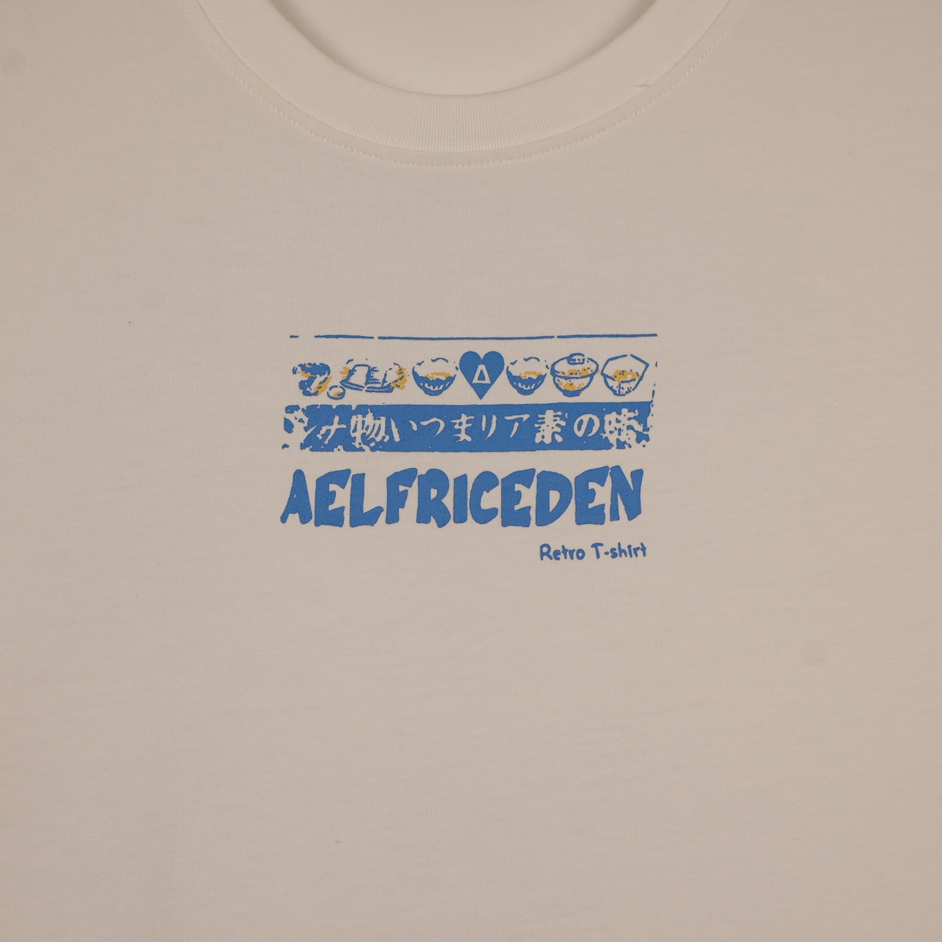 This Aelfric Eden tee features a clean front-and-back graphic printed in vivid blue ink, giving it that bold streetwear aesthetic. The design incorporates Japanese text and nostalgic packaging-style artwork — a perfect mix of minimal and detailed.