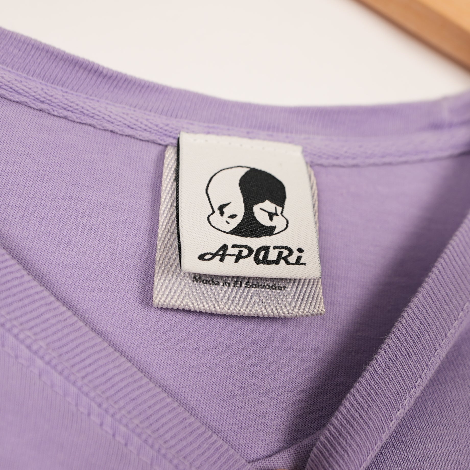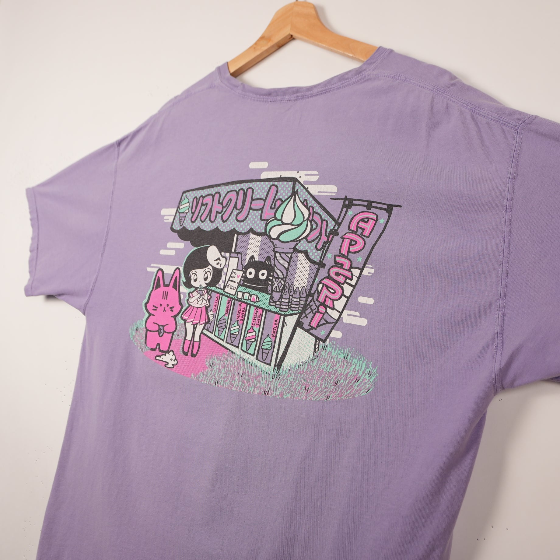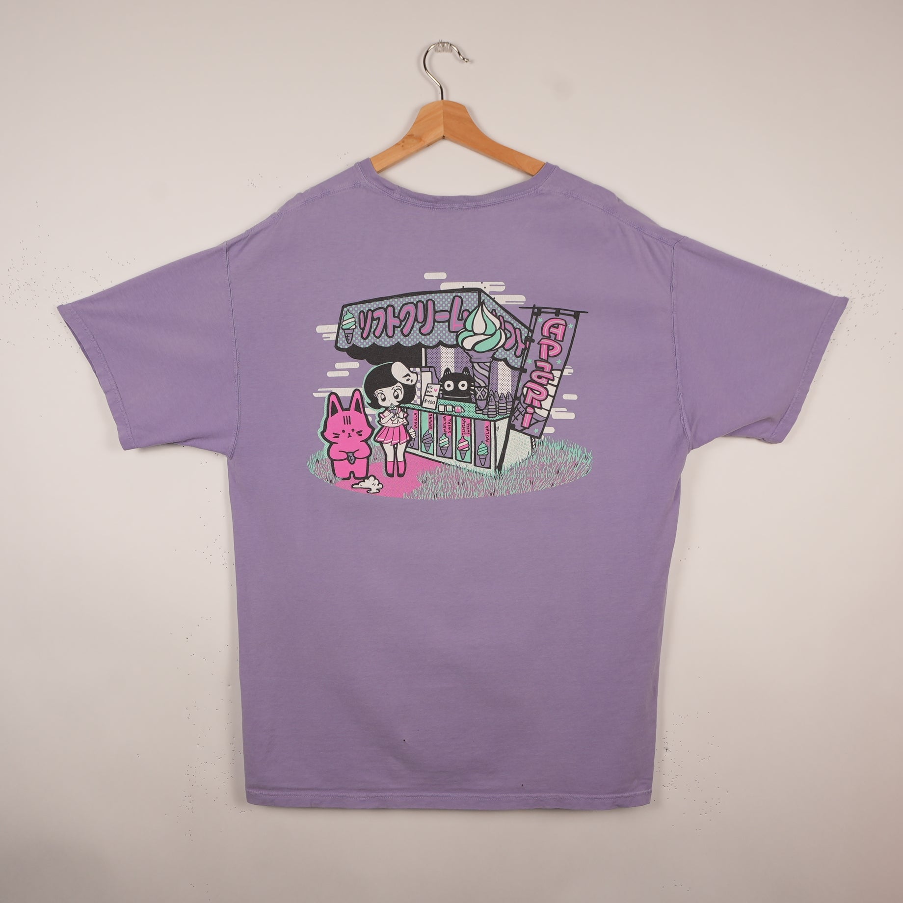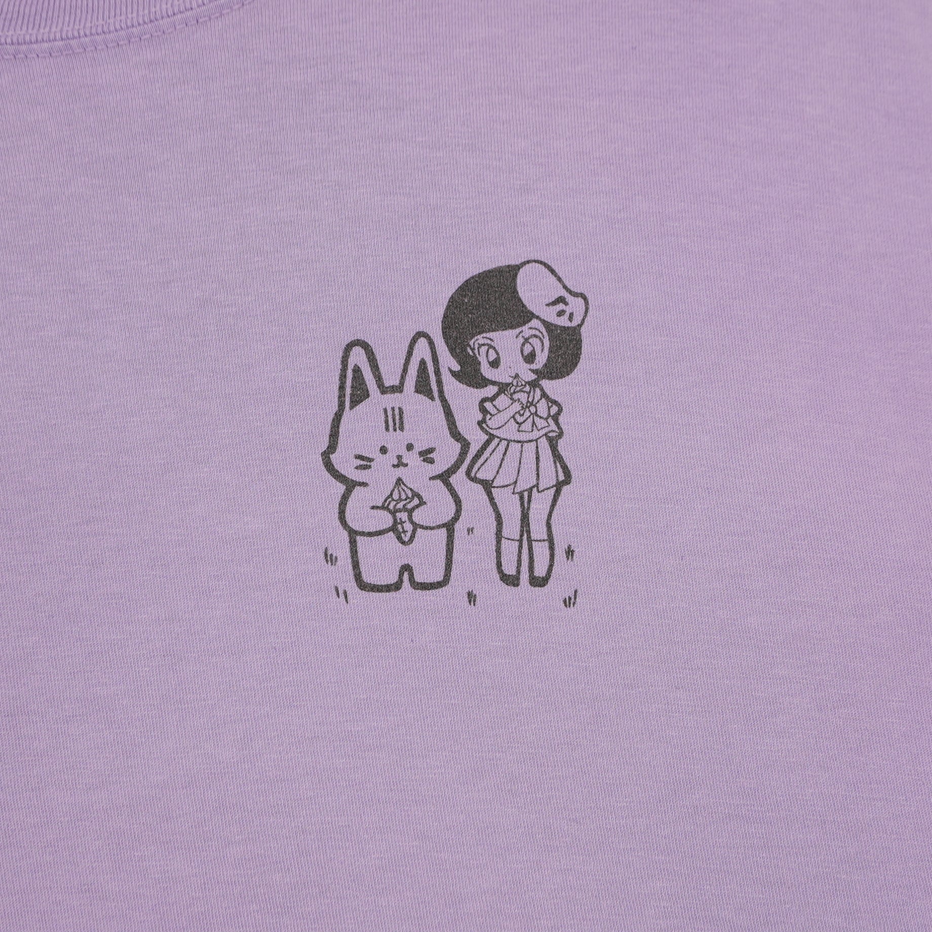 This one’s got that perfect mix of cute and bold — a lavender Apari Art tee featuring one of their signature colorful anime-style designs. The front has a small embroidered duo, and the back shows a full pastel illustration of a character and bunny at a neon ice cream stand. Easily one of the best pieces from Apari’s artwear line.