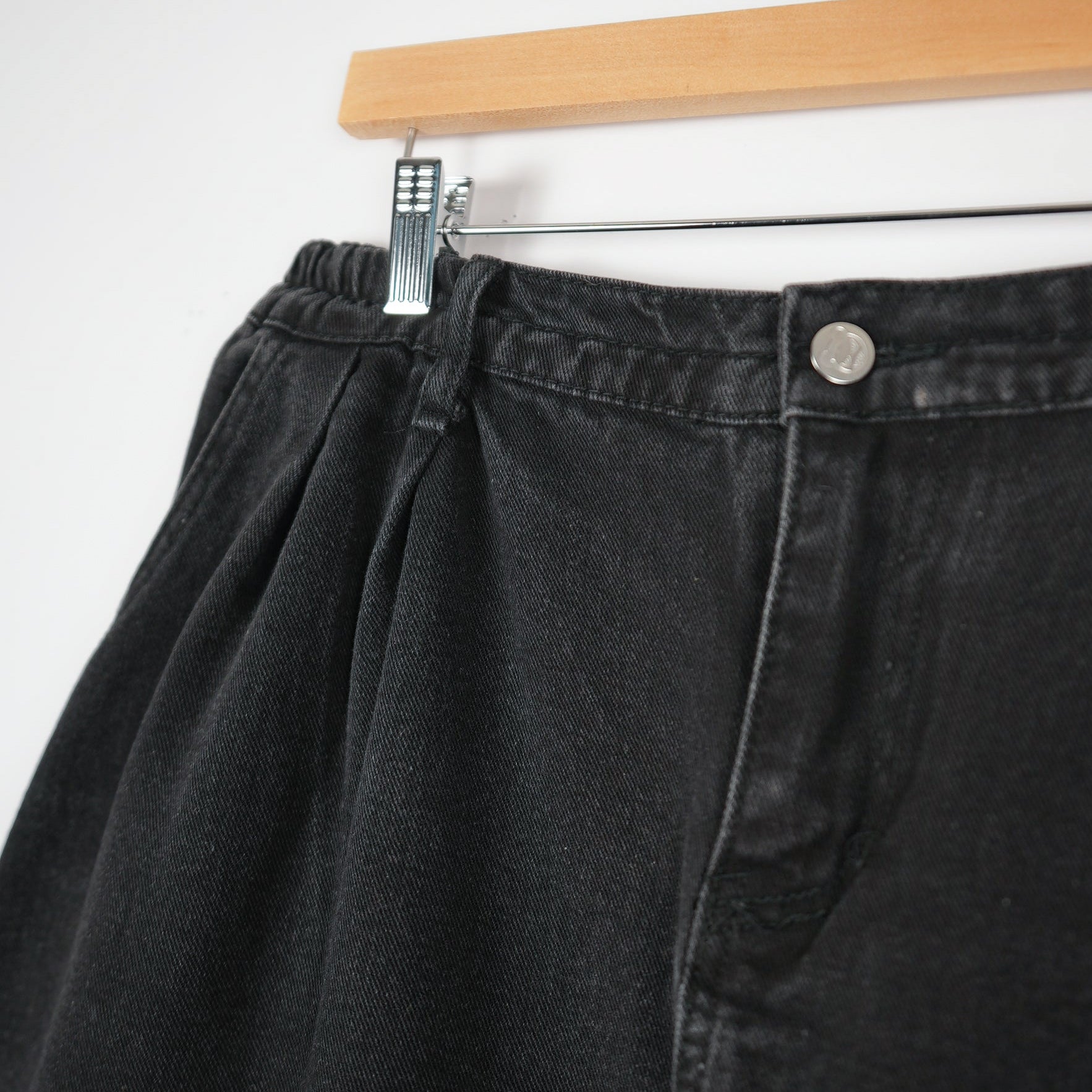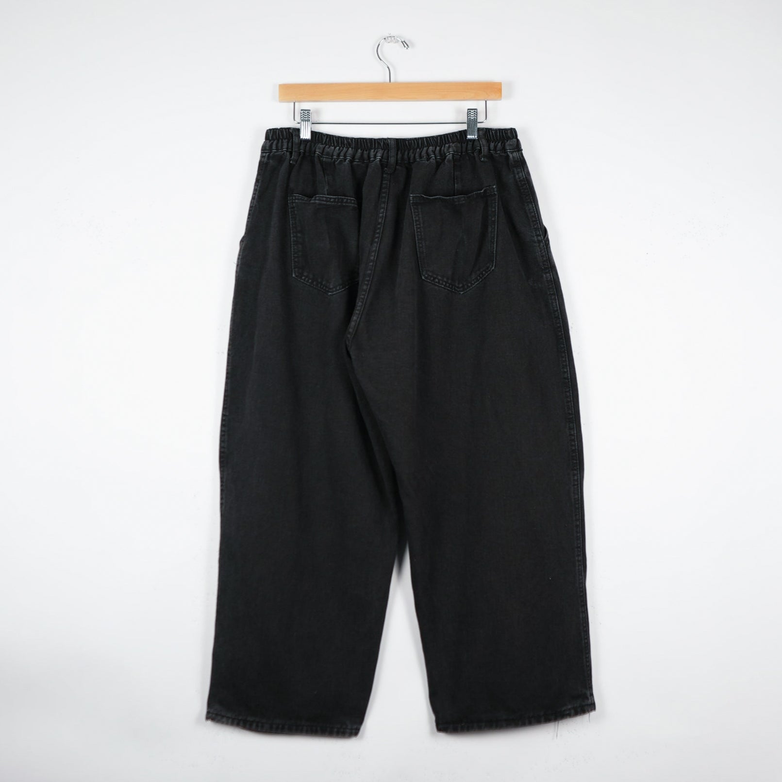 These unbranded black denim jeans feature a classic ultra-baggy silhouette with pleats and an elastic waistband for extra comfort. They’ve been worn and skated in by me, and they’ve got that perfect lived-in feel that just makes them better over time. Built for movement, styled for simplicity.