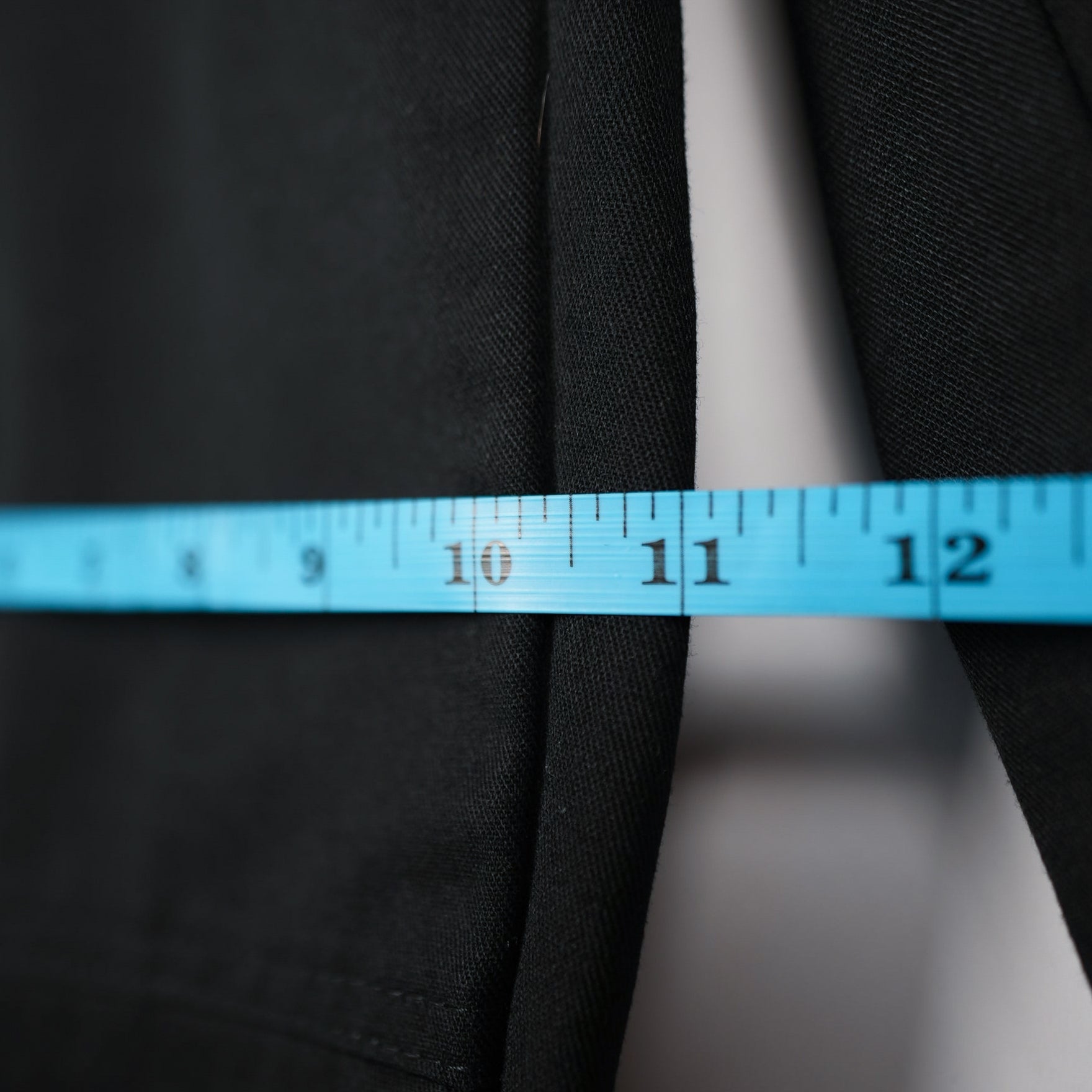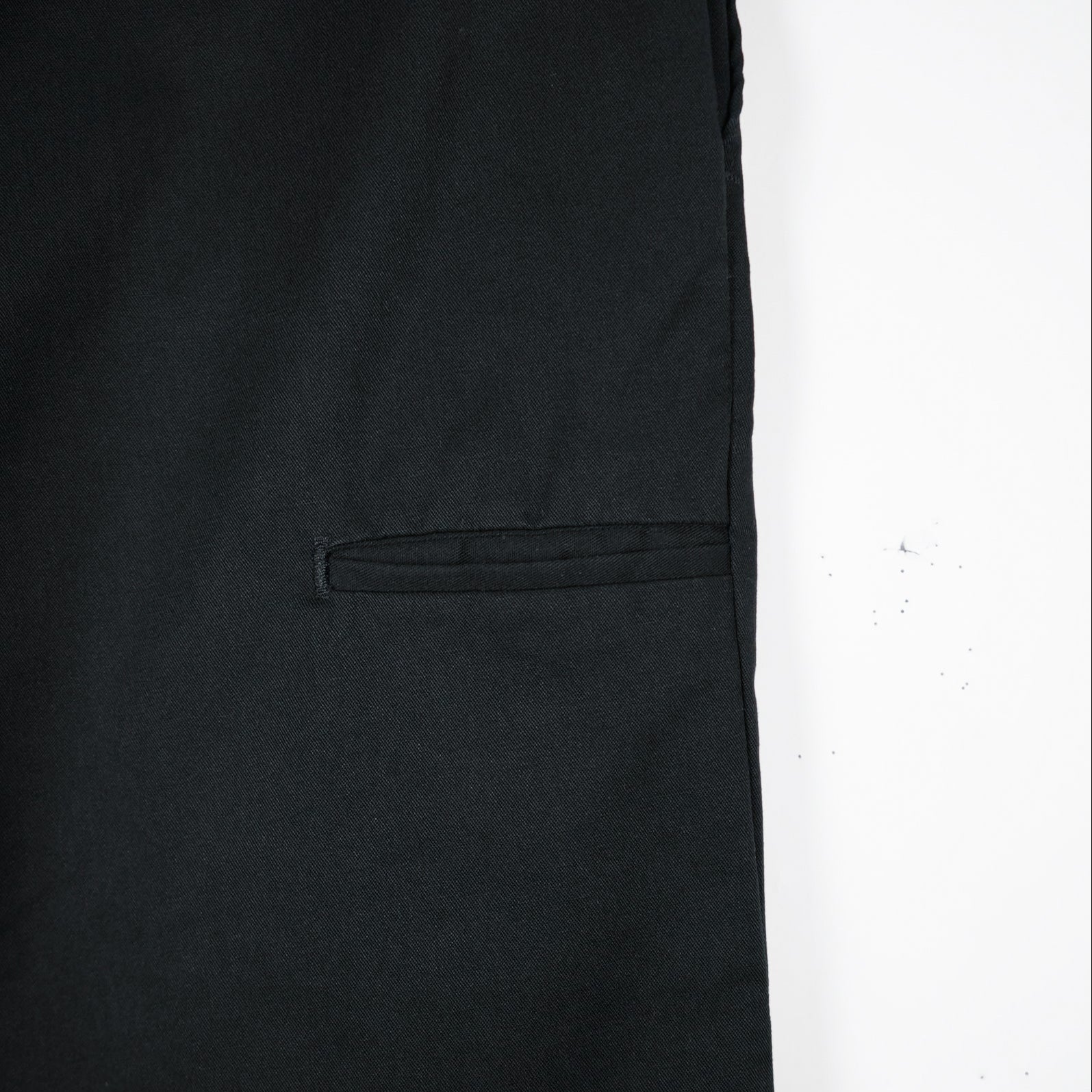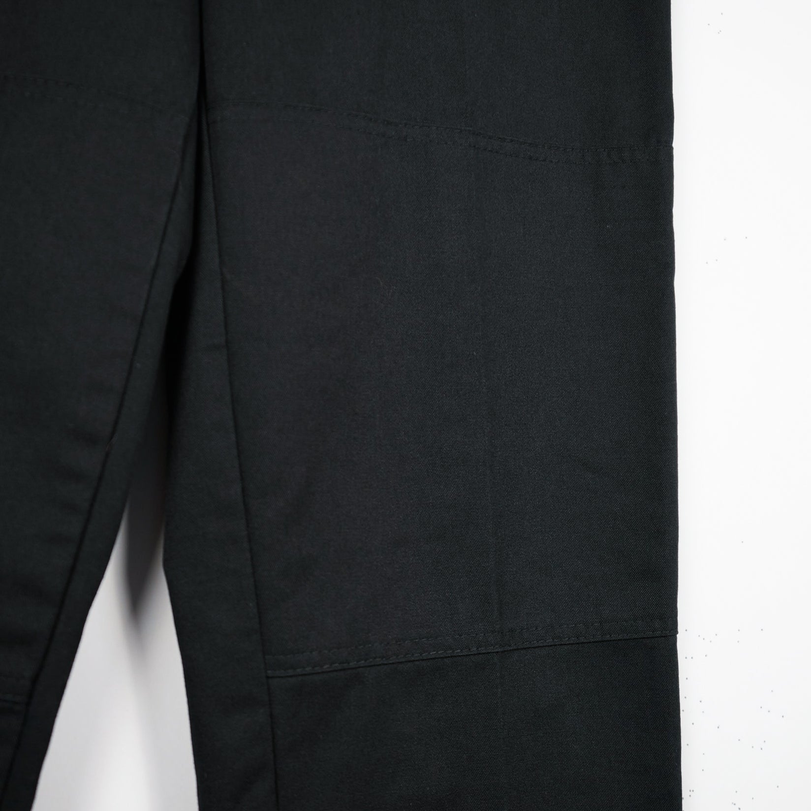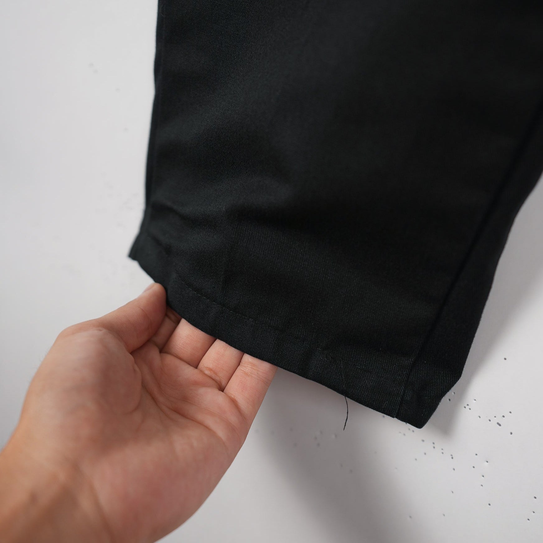 Details: Black cotton/poly blend, double knee paneling, side utility pocket, belt loops, no external logos for a clean silhouette.