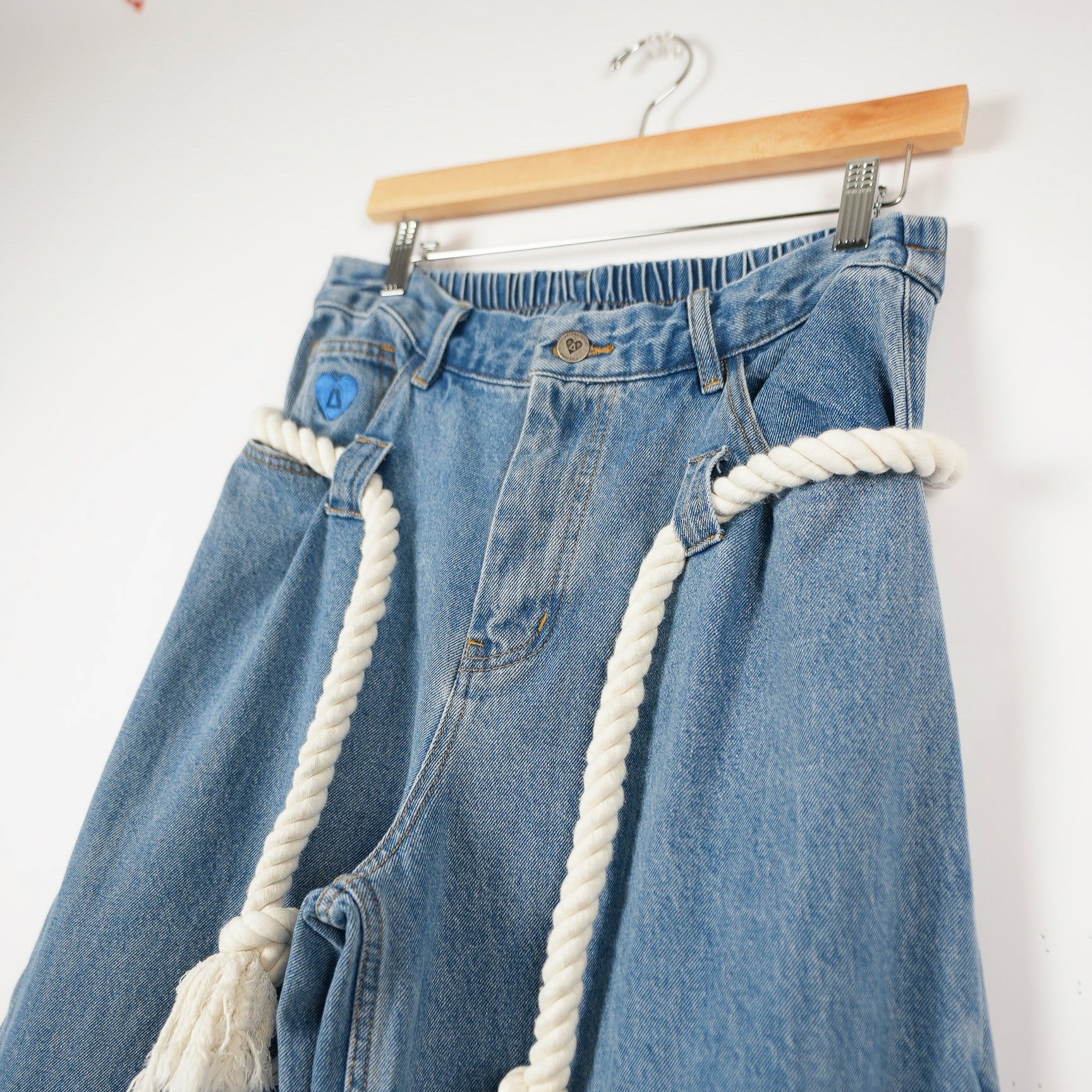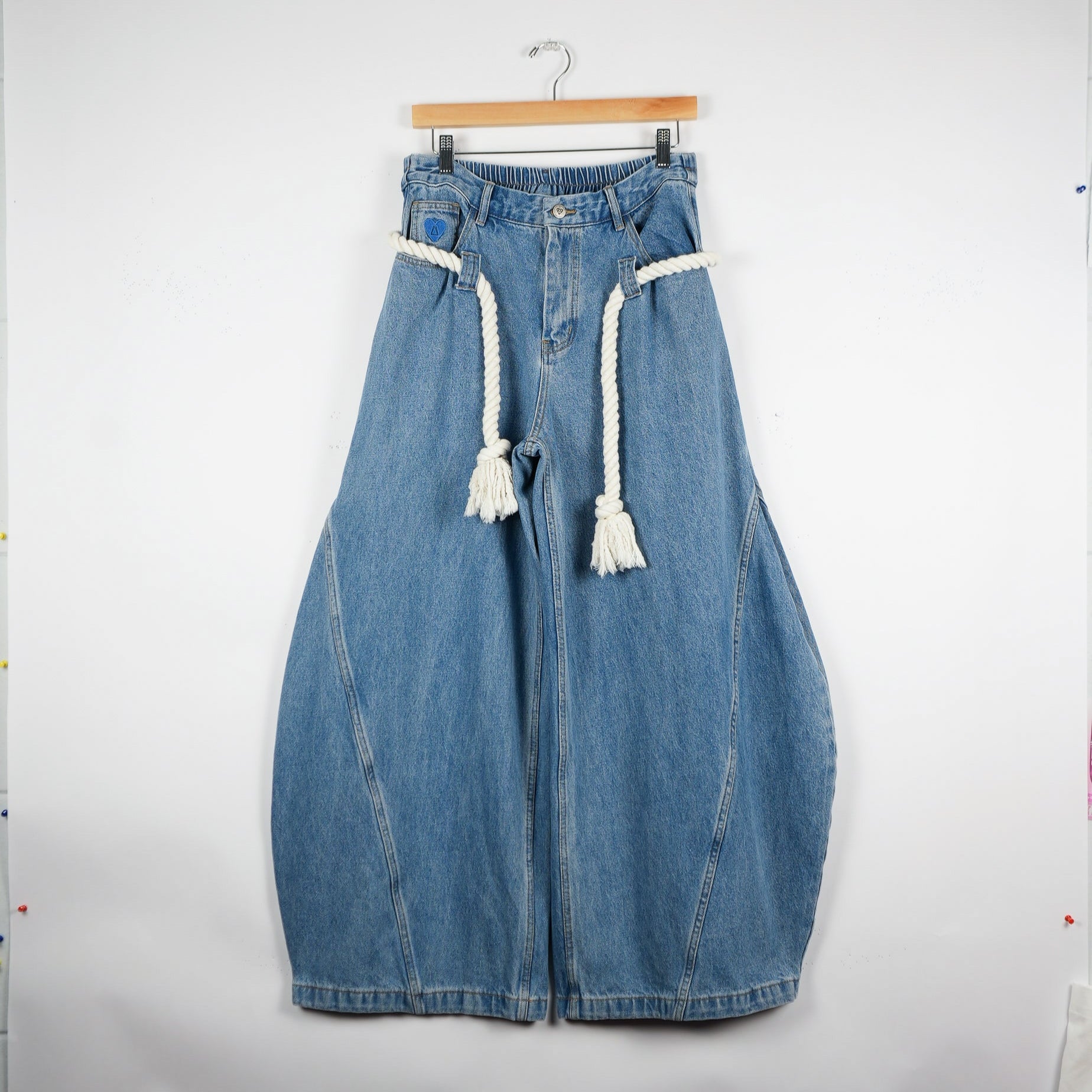 Details: 30” waist (elastic panel in back), 29” inseam, 16.5” wide leg opening. Built-in rope belt, heart embroidery at pocket, button + zip closure, and standard 5-pocket setup.