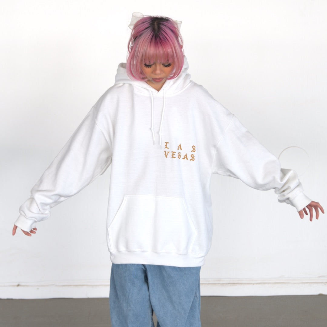 Details: “Las Vegas” chest print, large “Woke Up and Felt the Vibe” back graphic, Gildan Heavy Blend hoodie, front pouch pocket, soft interior