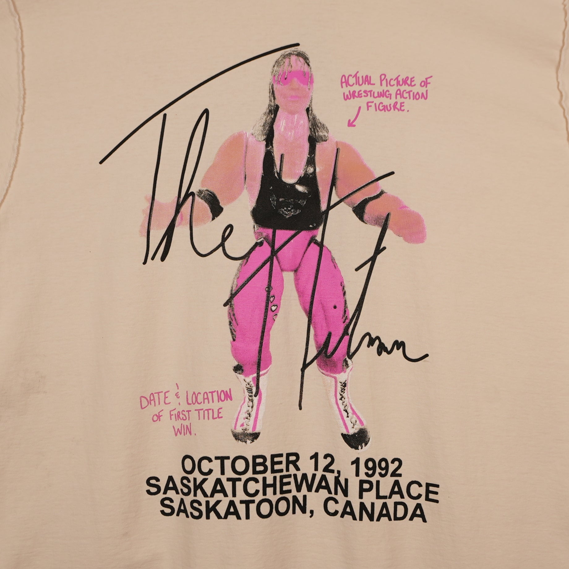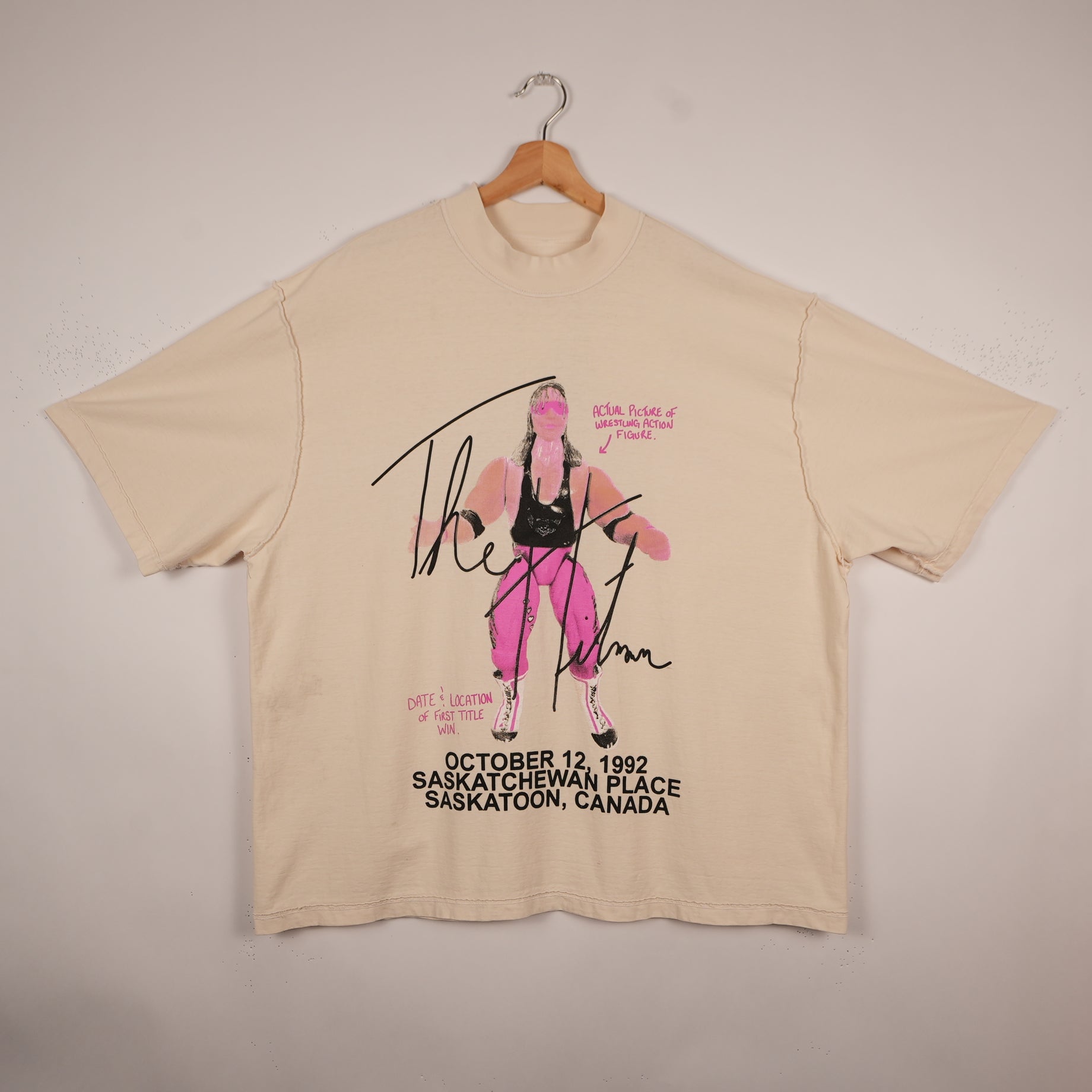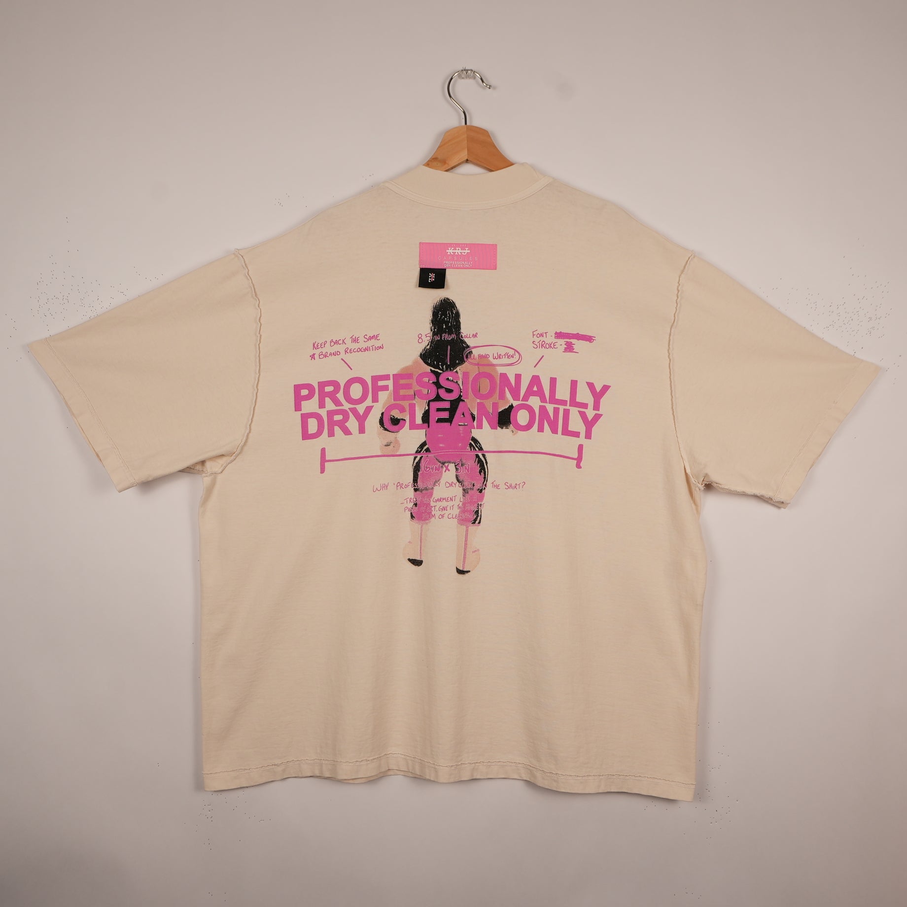 This KRJ Capsules Pink Label tee is one of the most creative and conceptual pieces in my collection. The print is intentionally inside-out, making the exposed seams and reverse graphics part of the design. It features a hand-drawn style graphic of a wrestler with artistic annotations and bold typography that reads “Professionally Dry Clean Only.”