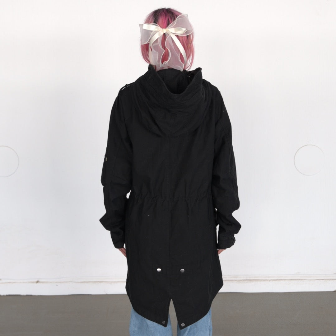 Details: Longline trench-style jacket, structured hood, adjustable waist, military-inspired details, “Remove Before Flight” sleeve tag