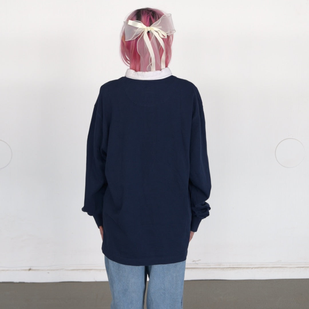 Details: Navy colorway, white chest panel with Pepsi logo, collared rugby-style neckline, long sleeves