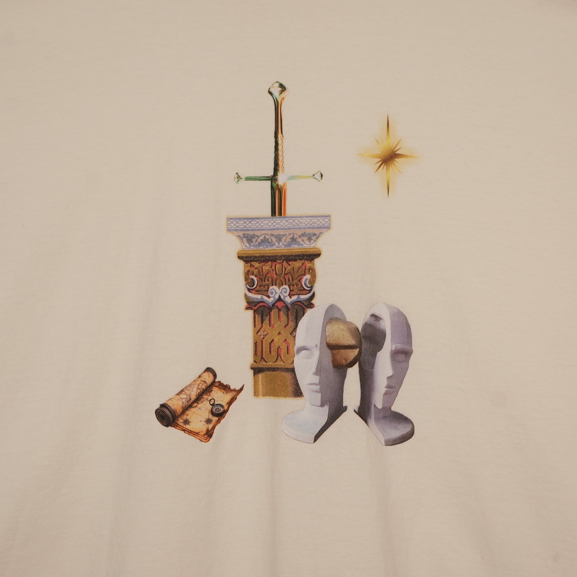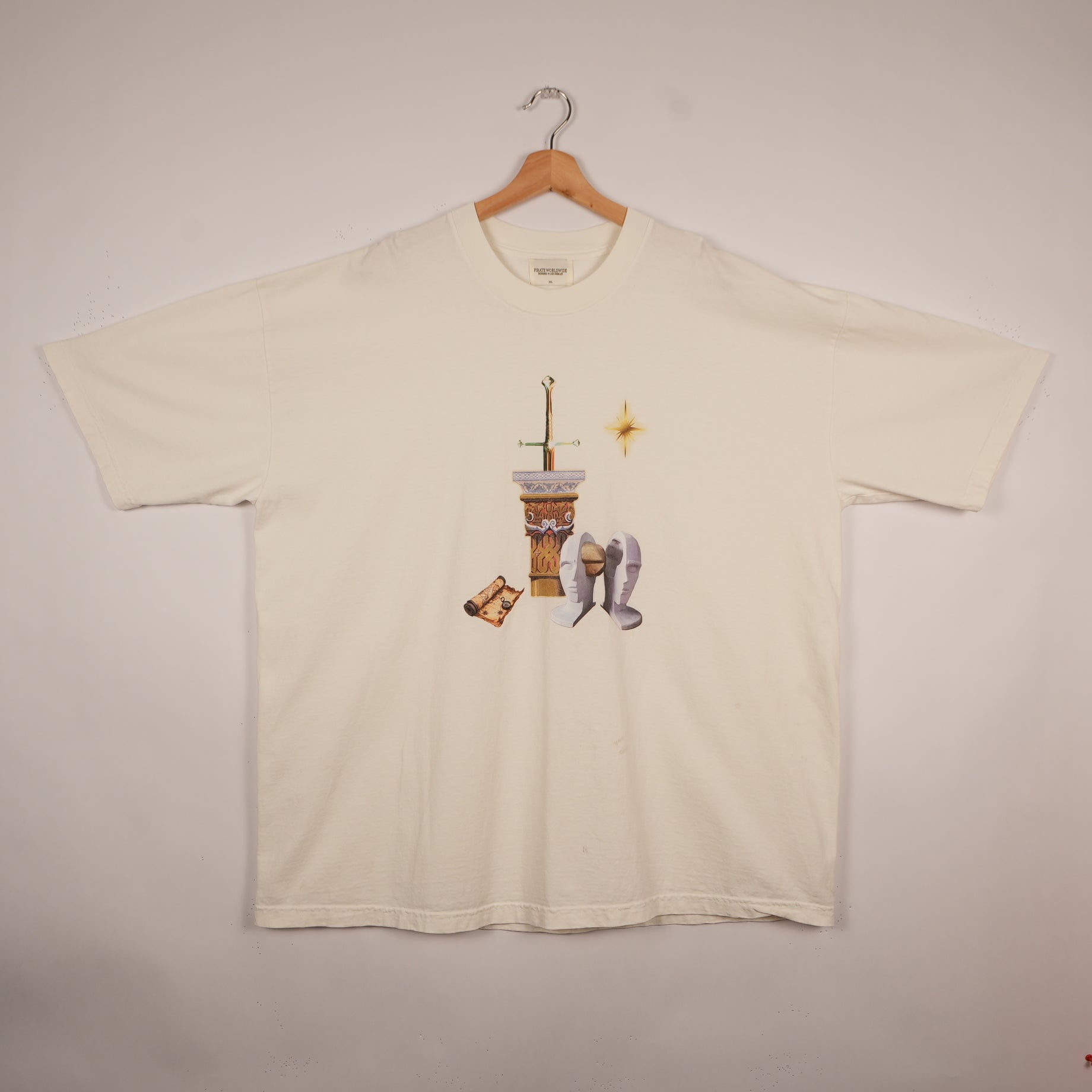 This Pirate Worldwide tee brings a clean minimal aesthetic with a fantasy-inspired twist. It features a centered print of medieval elements — a sword, a chalice, armor, a map, and a shining star — giving it an elevated yet mysterious look.