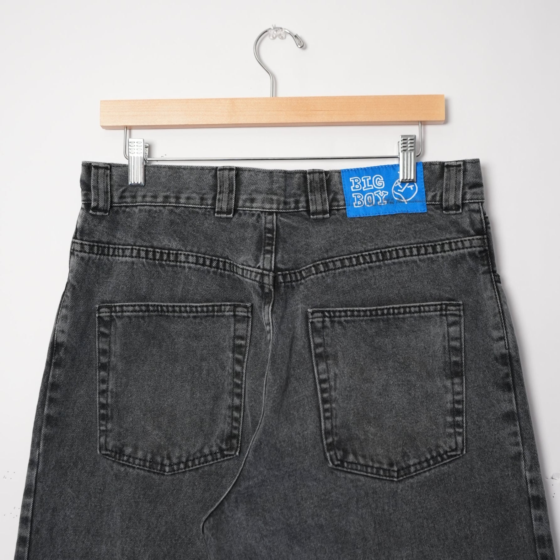 These Polar Big Boy Jeans come in a faded charcoal wash and feature the iconic embroidered Big Boy character on the pocket. Known for their wide fit and durable feel, these have been worn and skated in by me personally—breaking them in just right. The denim has softened up with wear, making them extra comfortable for skating or everyday use.
