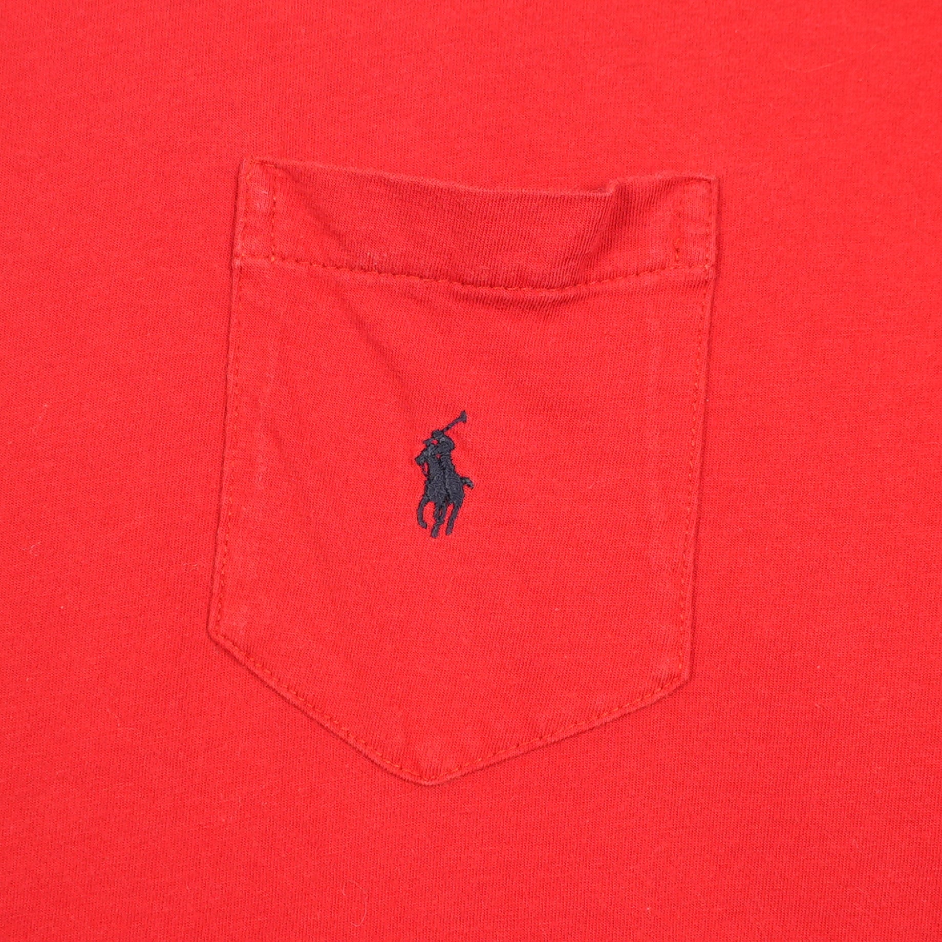 Details: Red cotton tee with single chest pocket, navy Polo logo embroidery, soft vintage feel.