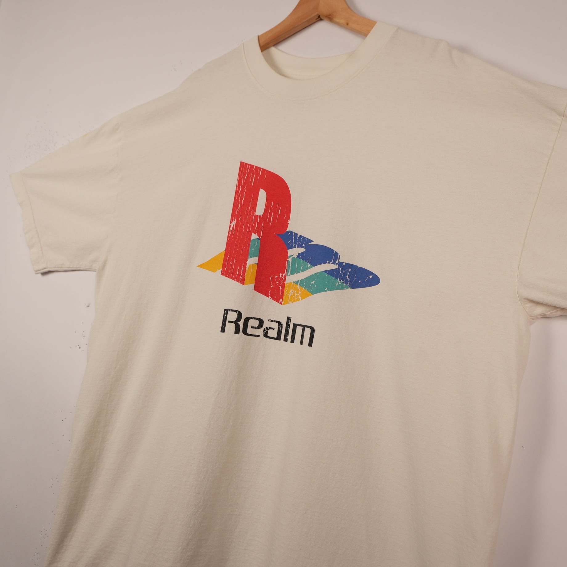 Details: Cream-colored heavyweight tee with PlayStation-inspired Realm logo on the front and bold text on the back.