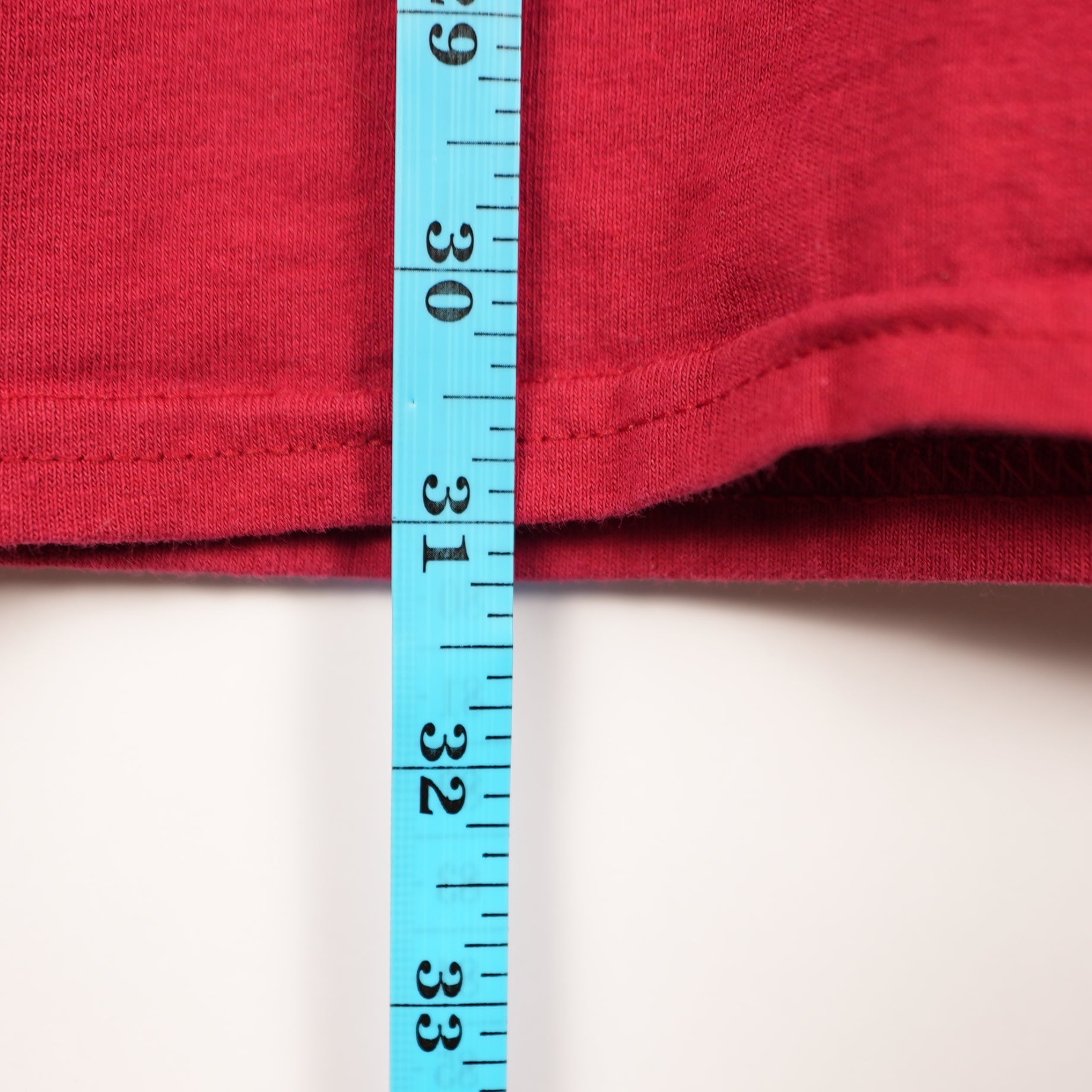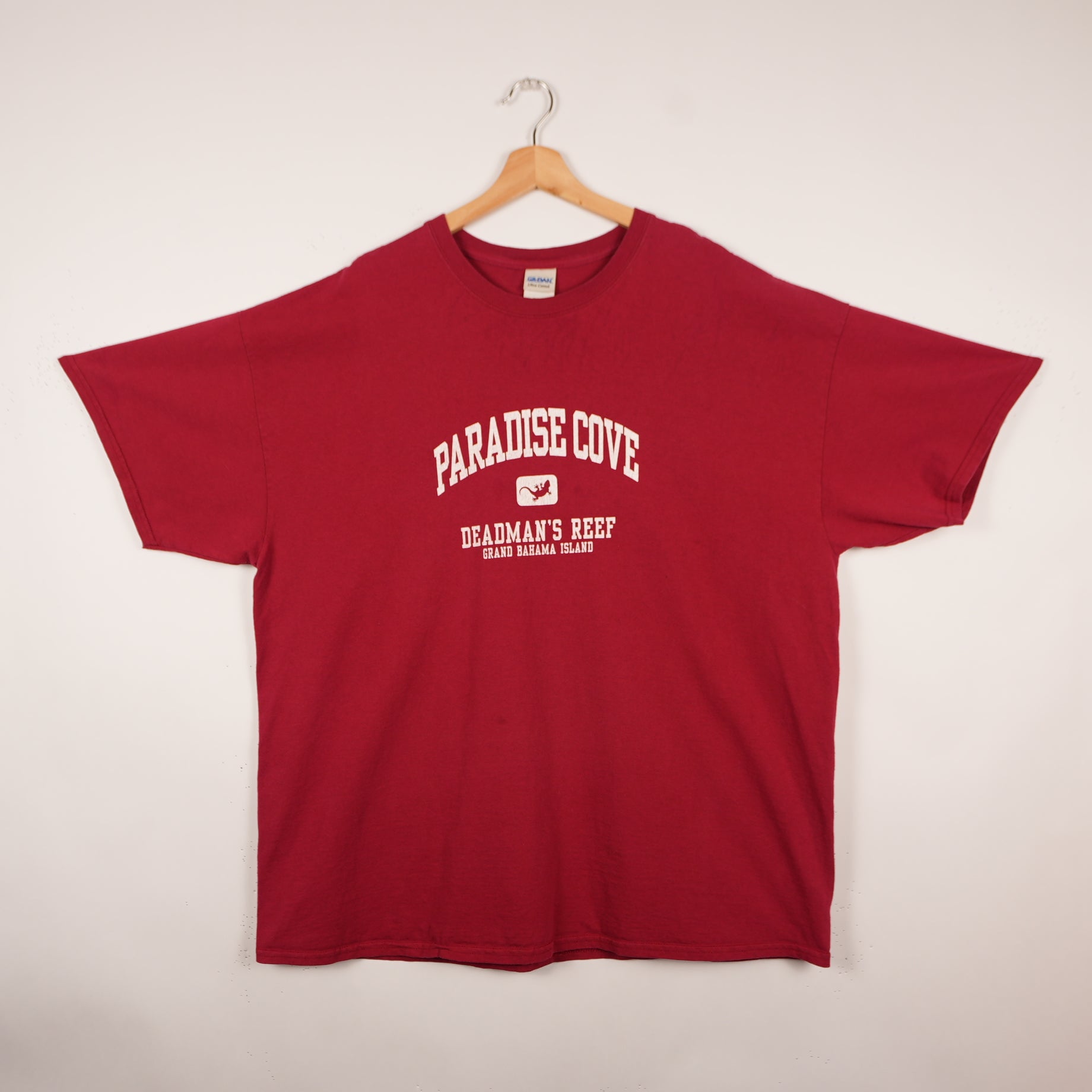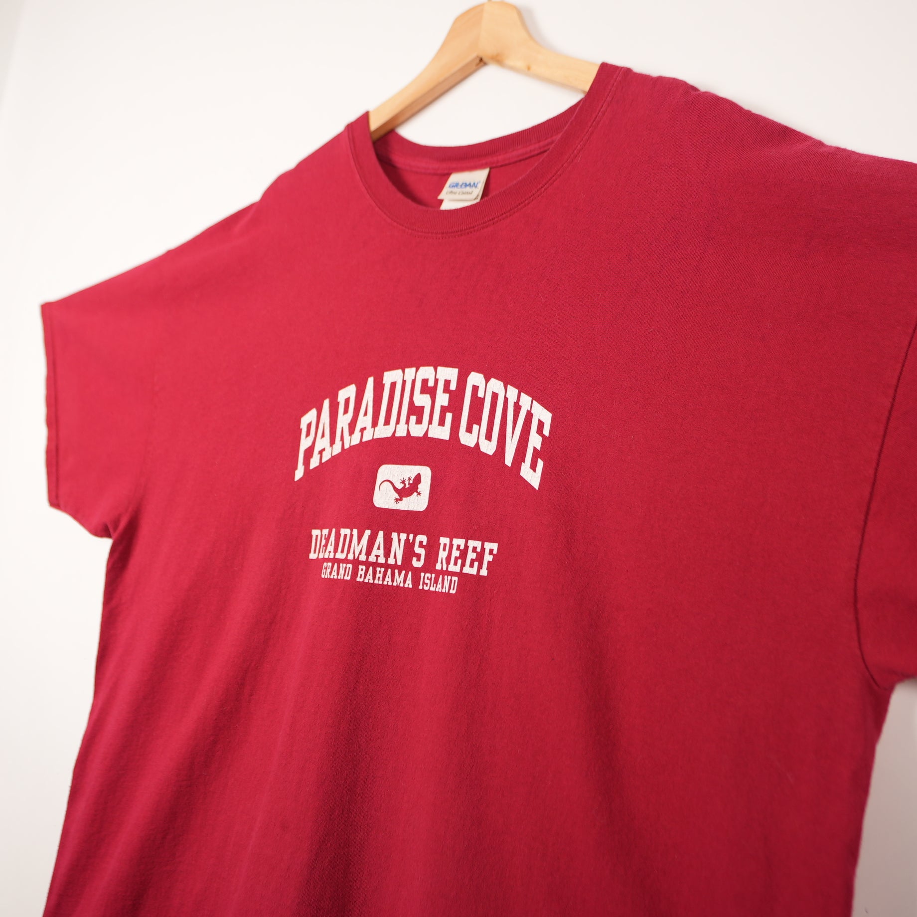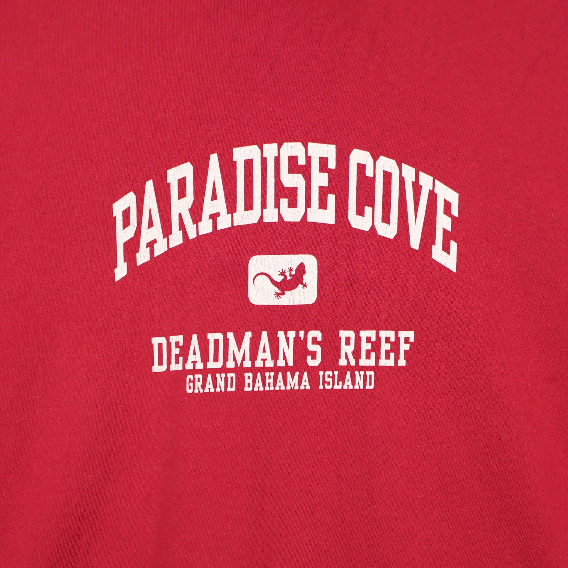 Bold red color with classic white varsity-style text that reads “Paradise Cove – Deadman’s Reef, Grand Bahama Island.” Oversized and flowy with that relaxed vintage fit that just hits right.