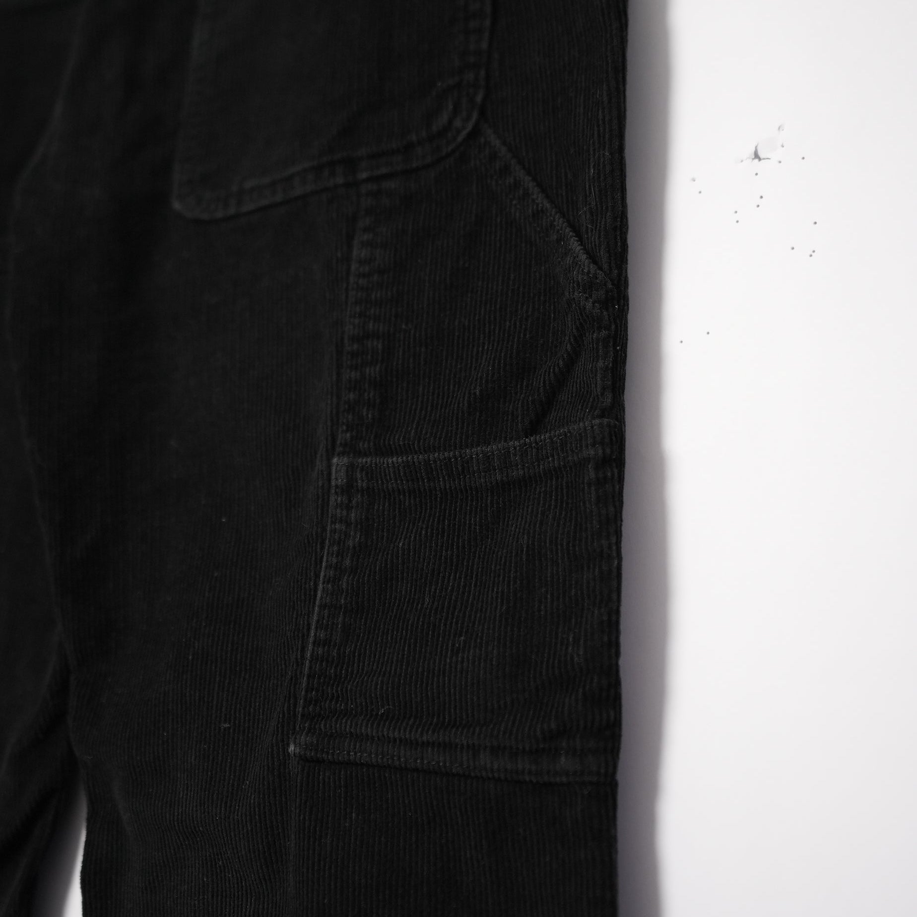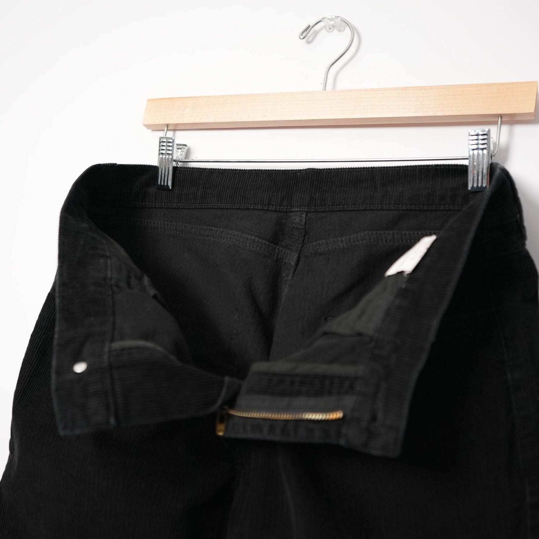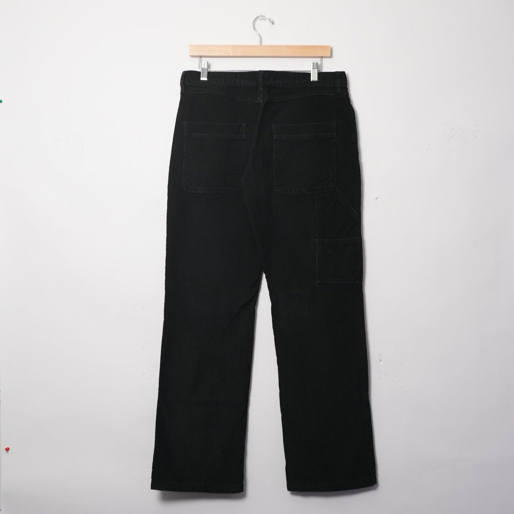 Details: Black corduroy fabric, side utility pocket, rear patch pockets, faux double knee design (single fabric layer).